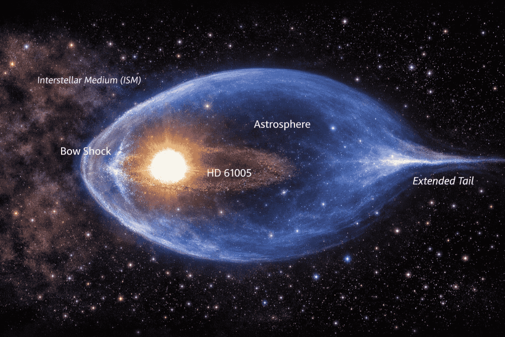 由于恒星在银河系中运动,它们周围的天体球通常并非完美球形,而更像彗星:迎风一侧形成弓形激波结构,背风方向则拖曳出长长的尾迹。在艺术想象图中,HD 61005的弓形激波位于运动前方,尾部向后延展,整体形态颇具动感。